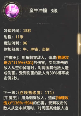 作为团队主力输出(主C)培养时,蛮牛冲撞值得优先投入。该技能提供120%基础物理伤害,并在暴击率提升后进一步放大实际输出。其附带的击倒效果虽仅有约30%触发概率,但一旦生效即可无缝衔接后续高伤技能,形成“控制→爆发”闭环,在Boss战或关键团战中显著提升瞬时压制力。