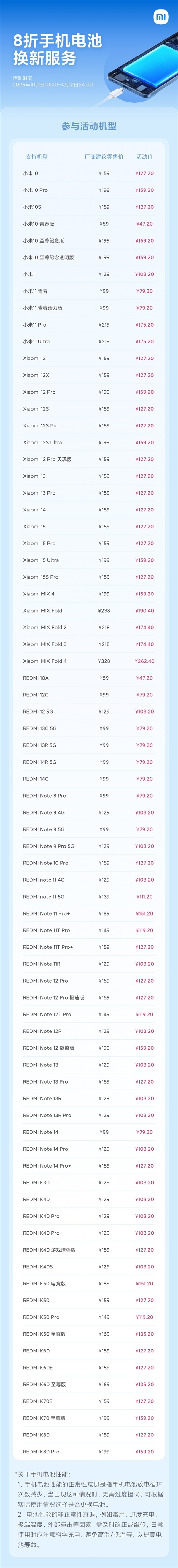 最低47.2元起!小米77款手机电池享8折换新