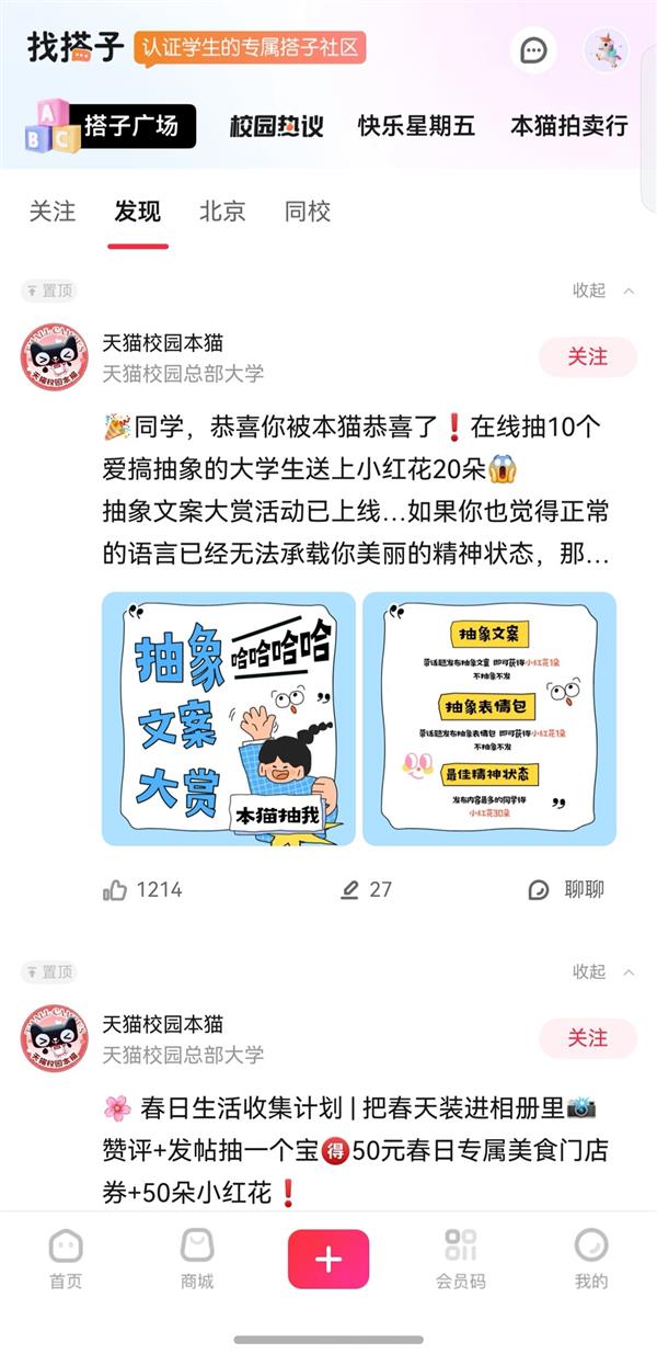 想参加大创比赛缺队友?想找同好一起追剧、运动?快来“搭子广场”一键摇人!还有“快乐星期五”和“本猫拍卖行”等超多丰富活动,校园生活瞬间多姿多彩!