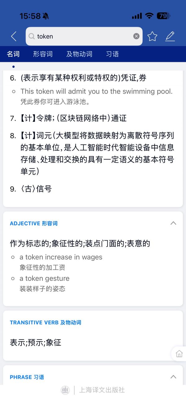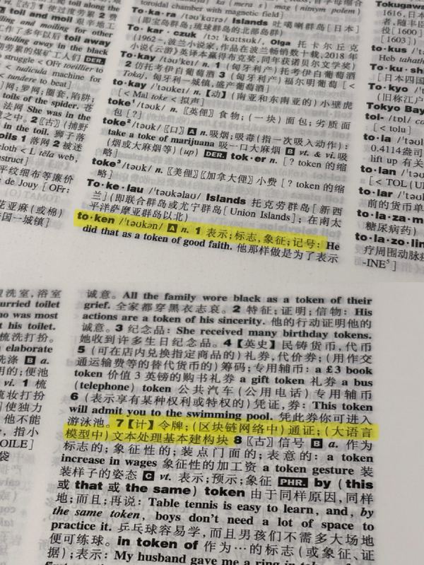 与纸质版《英汉大词典》(第3版)对比,2025年,英汉大词典编纂处即收录了这一词汇在AI发展语境下的释义:“7.【计】令牌;(区块链网络中)通证;(大语言模型中)文本处理基本建构块”,App中则更新为:“7.【计】令牌;(区块链网络中)通证”“8.【计】词元(大模型将数据映射为离散符号序列的基本单位,是人工智能时代智能设备中信息存储、处理和交换的具有一定语义的基本符号单元)”。