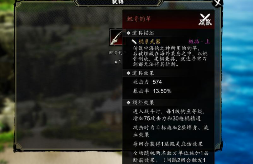 霓光岛设有两只常规宝箱:一只位于中部高地流浪武士身后,另一只需绕至高地背面,沿坡道下行后抵达。此外,该岛存在一只隐藏宝箱,开启条件为:已掌握蟹岛所获线索,且角色钓鱼等级不低于七级;开启后获得鲲骨钓竿——该道具具备实际增益效果,不仅提升自身钓鱼属性,还可为全体队友提供加成。获取后返回蟹岛与钓鱼翁对话,将获赠一本价值五百点钓鱼经验的技能书。