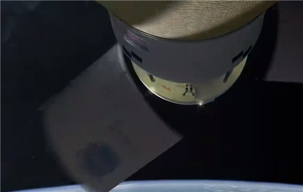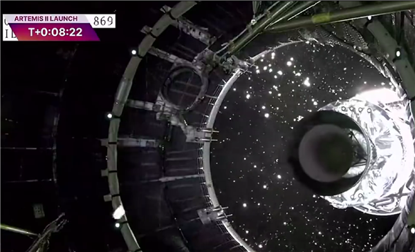 升空后8分多钟:火箭进入初始轨道,新一级助推器与二级火箭分离,猎户座飞船展开太阳能板。