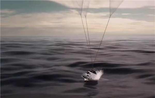 经历黑障区后,在加利福尼亚指定海域上空7.5公里处打开降落伞,海面降落,宇航员安全出舱。