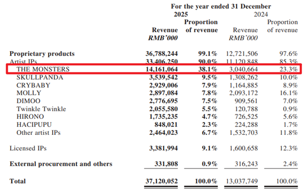 去年的泡泡玛特确实赚钱,但这钱很大一部分是 Labubu 赚回来的。一己之力撑起来近 38% 的收入。