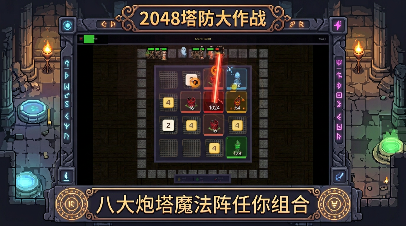 经典2048数字合并玩法与塔防策略的创新融合!滑动方块合成高级防御塔,抵御一波波强力怪物入侵。拥有8种独特炮塔、魔法阵系统和丰富道具,像素风美术搭配硬核策略,考验你的智慧与反应!
