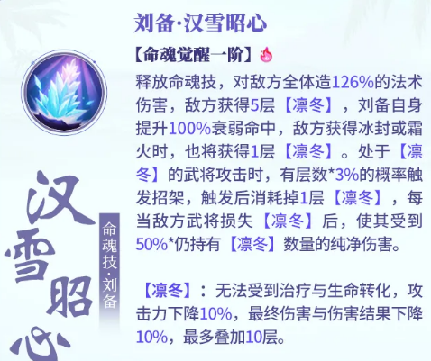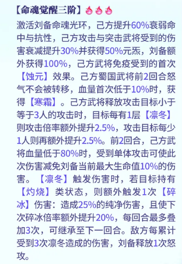 到了三阶,刘备的团队能力更完整了。命魂光环可以,提高己方的衰弱命中和抗性,让己方攻击和突击武将更能站住。刘备自己还能拿到更多元炁,队伍前期开局会更顺。蜀国武将在前两回合,不会被转走怒气,血量第一次低到危险线时,还会获得【寒霜】。这个效果相当实用,可以直接挡住后续伤害,容错高了很多。还有一点很重要,己方释放攻击人数不多的技能时,如果目标身上带着【凛冬】,技能倍率还会往上加。也就是说,刘备既能限制敌方,也能帮己方点杀打得更痛。再配合【灼烧】状态,还能触发【碎冰】伤害,打出额外纯净伤害,而且倍率会慢慢叠高。这个联动一出来,刘备和火烧队的配合就很顺了,冰火一起打,伤害节奏会很紧。