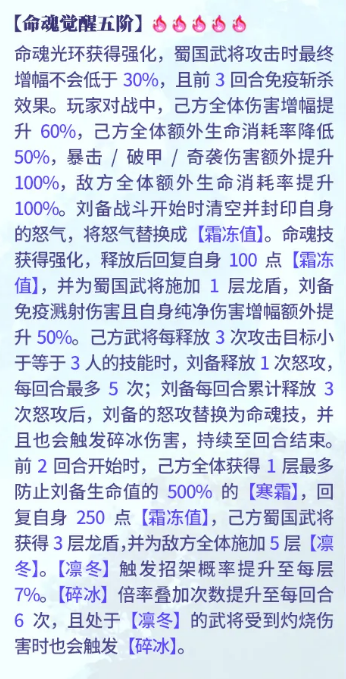 五阶后的刘备,可以说把机制彻底拉满。蜀国武将出手时,最终增幅不会太低,前几回合还免疫斩杀,队伍的稳定性明显上去了。最特别的是【霜冻值】机制,刘备会把怒气换成这个资源。敌方每次被挂【凛冬】,或者受到【凛冬】相关伤害时,刘备都能积累【霜冻值】。数值攒到一定程度后,己方攻击和突击武将,就会额外放怒攻,这让全队爆发频率高了很多。命魂技强化后,还会给蜀国武将加上【龙盾】,限制单次受到的伤害,前两回合开始时,全队还能先拿一层很厚的【寒霜】。如果刘备一回合里,连续释放多次怒攻,那么后续怒攻还会临时变成命魂技,继续给敌方施压。整体来看,命魂刘备很适合做蜀国队的核心辅助,也很适合放进火烧体系里,负责控场、增伤、保人和带节奏。
