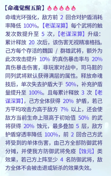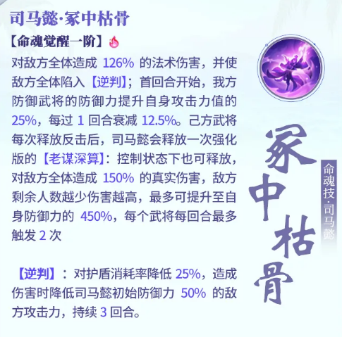 再看司马懿,他的命魂路线和刘备完全不同。司马懿更像是,把防守反打做到了很细。命魂觉醒一阶后,司马懿会先对敌方全体造成法术伤害,再施加【逆判】。这个状态会让敌方对护盾的消耗下降,同时在敌方造成伤害时,还会被削掉攻击力。这个效果不是直接爆发,但很实用,能慢慢把敌方输出压下去。首回合开始后,己方防御武将还能拿到额外防御值,前排会更硬。真正让司马懿开始发力的,是强化版【老谋深算】。己方武将每次打出反击,司马懿就会,跟着释放一次全体真实伤害,而且敌方剩下的人越少,这个伤害越高。这个机制很适合拖回合,战斗越往后,司马懿打出来的压制感越明显。