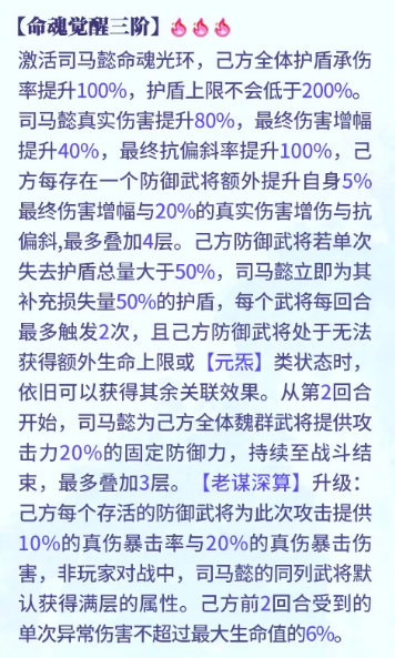 到了三阶,司马懿的护盾体系变得更稳。命魂光环会提高己方全体护盾承伤率,护盾上限也更高,不容易被一下打穿。司马懿自己的真实伤害、最终伤害增幅和抗偏斜,也都有明显提升。队伍里每多一个防御武将,他还能继续吃到额外加成,所以很适合走多前排阵容。另一个很实用的点,是防御武将如果单次失去太多护盾,司马懿会立刻补回一部分。这样一来,前排就不会轻易断盾,站场能力很强。从第二回合开始,魏国和群雄武将,还能继续得到固定防御加成,拖得越久越占便宜。与此同时,【老谋深算】还会因为防御武将的存活数量,拿到更高的真伤暴击率和真伤暴击伤害,伤害质量也在跟着提高。