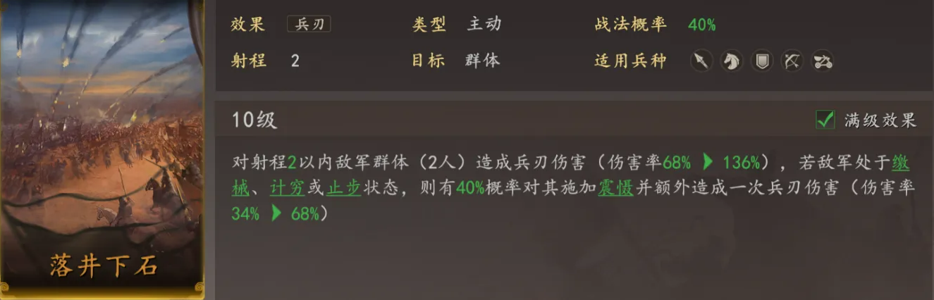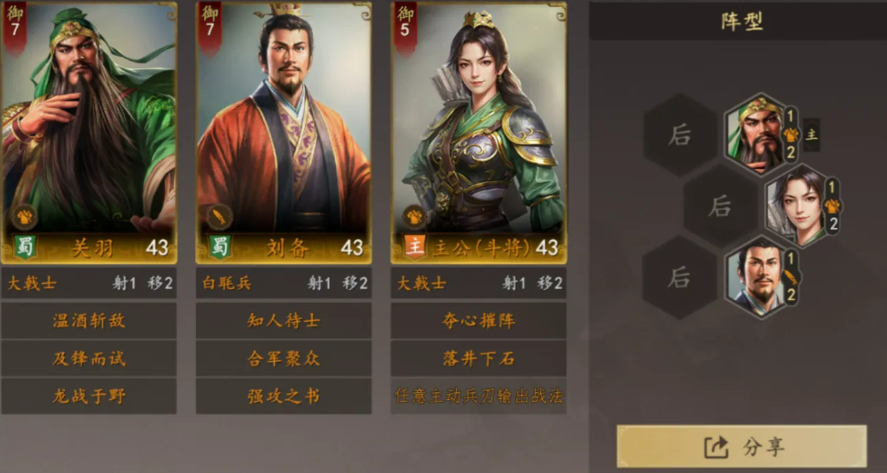 战术结构简洁高效:以刘备为功能型辅助,双核输出由主公与关羽承担。若追求极限爆发,主公可装配搴旗斩将或无坚不摧战法——依托其基础速度高于关羽的特性,实现先手破防,为关羽后续连击创造理想输出环境。刘备白毦兵自带两格范围内止步效果,主公搭配落井下石战法,可对被止步目标概率触发震慑控制。需注意:主公与刘备必须相邻布阵,否则落井下石的有效攻击半径无法覆盖止步单位,此细节直接影响控制链完整性。