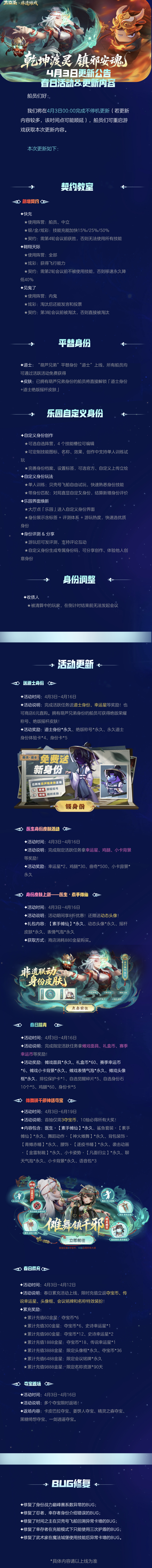 4月1日-4月6日,鲨鹅大战开启,上线体验愚人节限时彩蛋,送「鲨鲨&长鹅」头饰和刀盾语音包!4月3日起,登录送葫芦娃同款身份「道士」和傩戏「面具」!