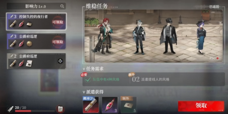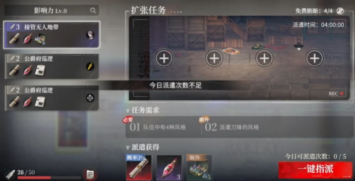 所谓“排班”,即游戏内正式名称为【派遣】的核心玩法。该系统允许玩家将角色指派至各类离线任务中,如夜间巡逻、街区探索、情报搜集等。任务全程无需手动操控,仅需在开启前选定四名角色——系统将自动推进倒计时,任务结束后角色即时返程,奖励直接发放至背包。所有派遣任务均标注明确耗时与对应产出,涵盖稀有晋升许可、突破材料、技能书及基础经验等关键资源。