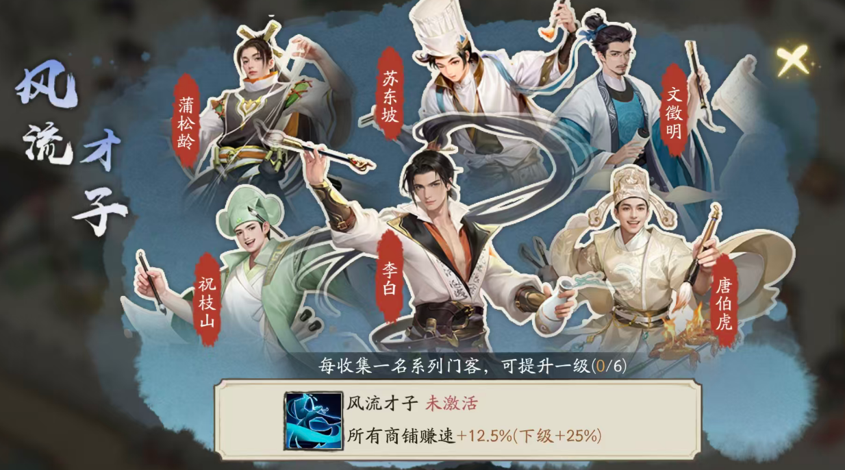 苏东坡还可参与“风流才子”羁绊体系构建。该羁绊需集齐6位指定历史人物门客:苏东坡、蒲松龄、祝枝山、李白、唐伯虎、文征明。其中祝枝山支持通过直购方式获取,其余成员均出自同一扭蛋池。当6人全部集齐,全商铺基础盈利速度将提升12.5%;每新增1名该系列门客,羁绊等级同步+1,逐步解锁额外增益效果。各角色在扭蛋界面均标注详细技能说明,例如苏东坡的三项专属能力——“热情好客”(提升顾客停留时长)、“尽心尽力”(增加单次消费金额)、“笑口常开”(降低顾客流失率),三者协同作用于接待环节,形成闭环式收益强化。