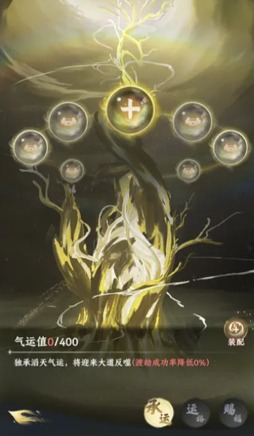 该系统以“承运神树”为视觉载体,直观呈现当前已解锁的气运格位数量与承载状态。初始仅开放1个空置格位,需通过进阶突破逐步解锁,上限为8格。每多解锁一格,即可装配额外气运词条,叠加天命承载效果。需特别注意:所有气运均与天道规则深度绑定,其总承载数值不可超过100点。一旦超限,将触发天道反噬,导致持续性负面状态,严重削弱修炼收益。