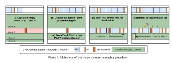 这些翻转一旦发生在GPU页表中,即GPU用来管理自身内存访问权限的映射表,攻击者就能篡改GPU的内存视图,将其重定向至主机CPU内存空间,从而突破隔离边界。