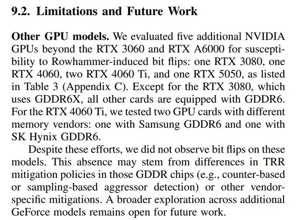 不过并非所有GPU都中招,研究团队同步测试了RTX 3080、RTX 4060、RTX 4060 Ti和RTX 5050,均未观测到位翻转现象。