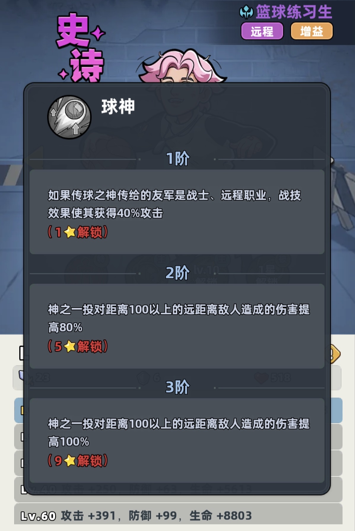 在阵容构建层面,篮球练习生具备出色的阶段延展性。前期可作为主C,搭配变异人(坦克)、空姐(治疗)及其他单体输出,快速推进主线关卡;中期无需替换,转为功能型辅助,持续提供全队攻击增幅,支撑整体DPS上限;后期若引入神话级主C,他仍可稳固担任副C或增益核心,配合厨神(治疗位升级)、学生妹(功能输出)等角色,组成高性价比平民毕业队。其史诗品质带来的低获取门槛与零氪友好养成路径,使得角色满命、技能全满状态极易达成,实战表现远超品质预期。
