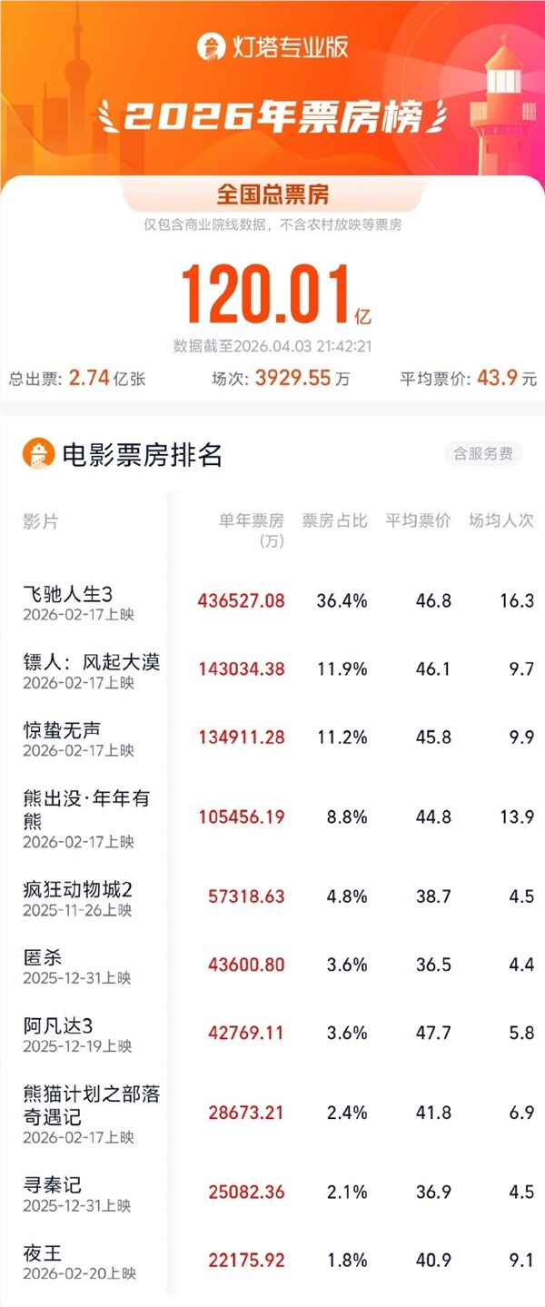 截至今晚21时42分,2026年度全国电影大盘票房(含预售)正式突破120亿大关。