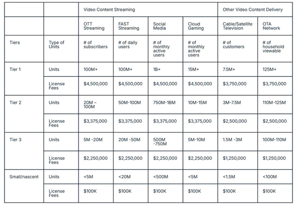 此次Via LA的费率调整是编解码器授权成本全面攀升的一部分,Avanci Video专利池和Access Advance的视频分发专利池均在向流媒体服务追索HEVC、VVC、VP9和AV1的内容版税。
