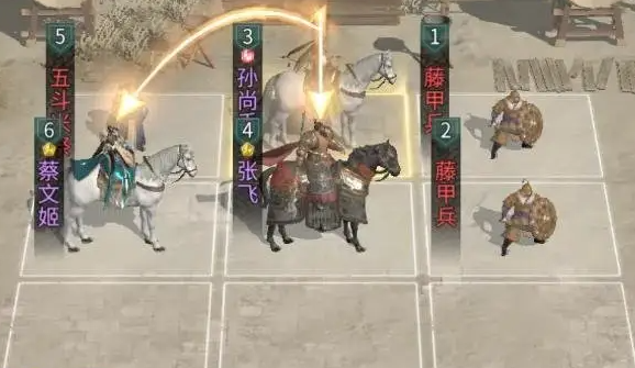 第三套为「虎啸连击速攻队」:张飞、孙尚香、蔡文姬组合。此阵容突出女性武将协同优势与张飞的群体压制能力,攻防转换流畅。蔡文姬天赋提供自身增益强化,并稳定治疗孙尚香,保障其持续作战能力。孙尚香在拥有追击次数时,优先锁定敌方威胁度最高目标发动技能,造成伤害后以60%概率触发武力比拼,比拼胜利则再次激活天赋,实现多段连续输出。张飞则通过技能对横排敌人施加多段攻击,累积回合后附加「虚弱」状态,系统性削弱敌方全体武将的武力属性,形成实质性战力压制。