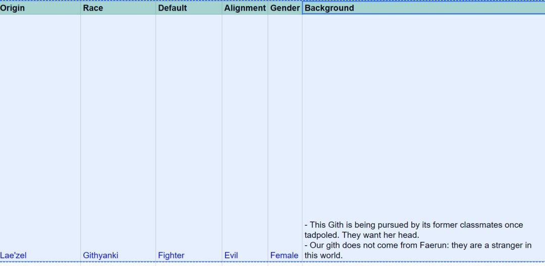 其中一条设计笔记写道:“这名吉斯洋基人在被植入夺心魔蝌蚪后,遭到了昔日同窗的追杀,他们想要取她的性命。”而在最终发售的游戏里,她只是与同族失散,而非被他们追杀——只有当她选择反抗弗拉基斯时,才会出现这种情况。即便到了那时,吉斯洋基人追杀的也是整个小队,而非她一人。