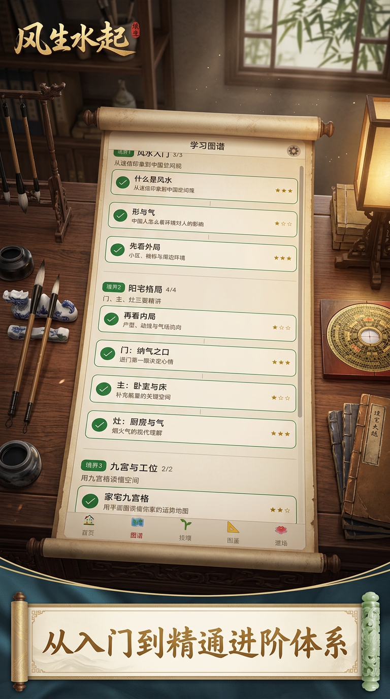 《现代风水101》是一款把“风水”从玄学,拉回到你真实生活里的互动学习游戏。不需要罗盘,不用死背术语。你只要带着自己的「家」和「工位」进来,就能一边玩,一边重构自己的生活空间。在游戏里,你会:拆解经典风水概念用关卡和问答,学会从“门、床、灶”三个核心点,看一套房子的大致好坏;学会用九宫格把自己的家切成 9 块,理解哪些区域对应事业、关系、健康与学习。动手“画”出自己的空间在游戏里勾勒你的户型、卧室摆放、工位位置,系统会带你完成一份「家宅九宫体检」与「工位风水小诊断」。做一点现实中的小调整换个床头方向、清出玄关的杂物、调整工位背后的位置,或只是给某个角落加一点光;再回到游戏里记录调整前后的感受,解锁新的提示、结局与称号。《现代风水101》不是在替你算命,而是在教你:用一套源自中国传统、但可以用现代语言解释的空间逻辑,重新看见你住的地方、你工作的地方,以及你和它们之间的关系。当你通关之后,你会多一套“随身工具”:看房、租房时,知道如何粗判一个空间的优劣搬家、换卧室、换工位时,有一套可复用的检查表每当觉得“最近都不太顺”,知道可以先从环境排查和微调开始,而不是只怪自己运气不好这是一款可以反复打开的游戏。它更像一本会跟着你换房、换工作、换人生阶段一起更新的「现代风水手册」,只不过,你是用“游戏”的方式把它学完的。