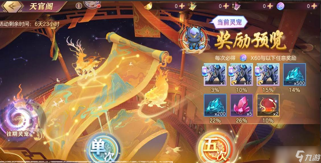 天官阁是这次活动的核心抽卡入口。用「幻穹券」或者限时道具「秘灵券」都可以召唤。每抽一次,必定获得「魂宠币」×60,同时有概率抽到「凌霄·星宿马」整体、碎片,或者「璇玑」、「瑶光」、「碎星」这三种养成材料。这三种材料是用星光提炼出来的,专门用在无双灵宠的淬星仪里面,可以提升灵宠属性,养成党要注意多囤一些。抽卡攒下来的「魂宠币」,可以在界面右下角的「灵宠宝库」里兑换。里面有往期稀有灵宠碎片、璇玑、瑶光、碎星,还有无双助力精选箱和随机3星稀有圣物,选择还挺多的。