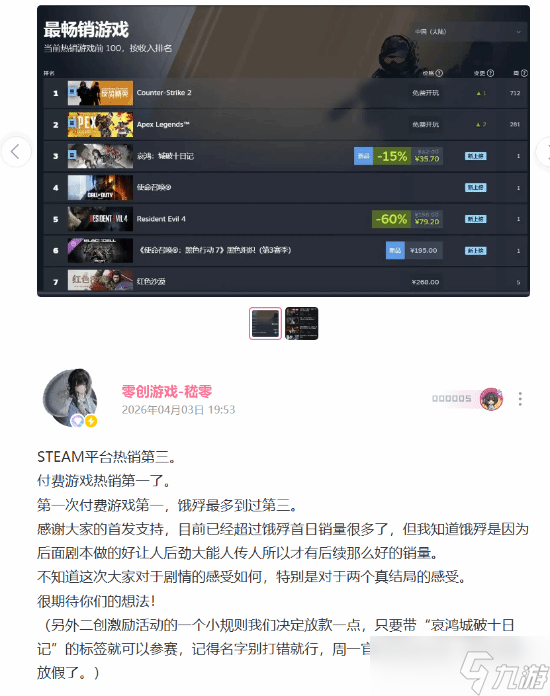由饿殍:明末千里行原班团队开发、2P Games负责发行的明末背景文字冒险游戏哀鸿:城破十日记,已于2026年4月5日正式登陆Steam平台。游戏发售后迅速引发广泛关注,上线当日即登顶Steam平台付费游戏热销榜首位。发售前20小时内,销量达45671份,包含预售激活码的兑付数量;首日总销量预计接近五万份。