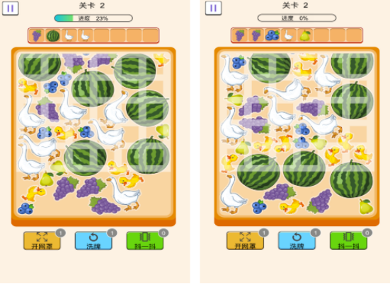 Q版画风搭配三消底层规则,构建出别具一格的“抓取解谜”体验。关卡中随机分布西瓜、大鹅、水果与小动物图标,玩家需拖动网兜覆盖三个及以上相同元素实现消除。既可专注捕捉鹅群,也可灵活切换目标达成连击,策略性与随机性并存。