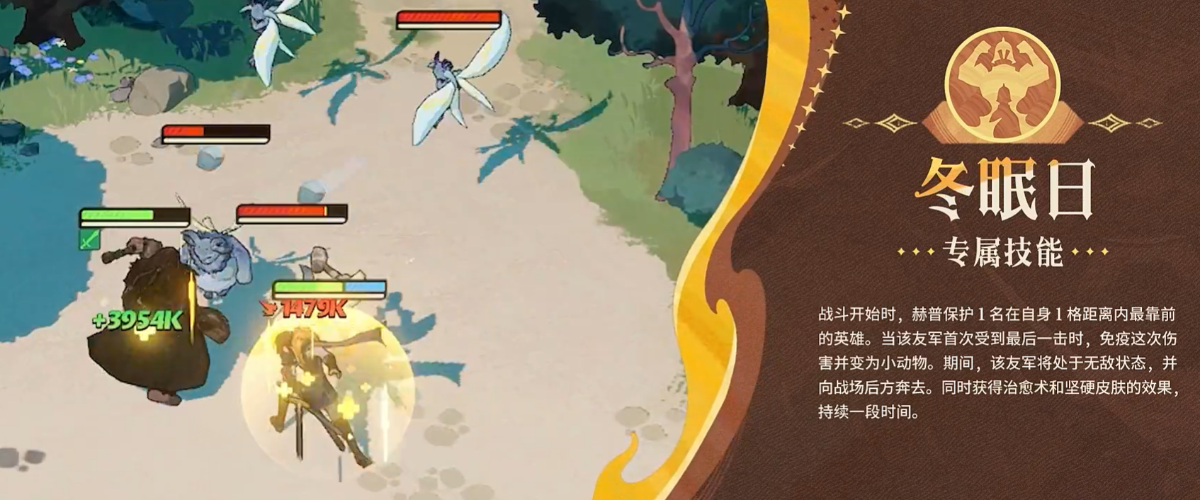 专属技能“冬眠日”构成赫普不可替代的战略价值。战斗初始,自动锁定距离自身1格以内最靠前的友方单位作为保护目标;当该目标首次即将被击杀时,立即触发完全免伤,并将其转化为无敌小动物形态向后位移,期间持续恢复生命值并获得护盾加持。此机制在高难度挂机关卡中具备决定性意义,常成为保下主力输出、逆转战局的核心支点。