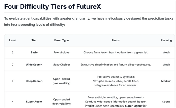 FutureX采用的是“折叠式”评分逻辑,拒绝模型靠蒙对简单的“是与否”来刷分。它大幅压缩了二元对立事件的数量,并将难度分为四个等级: