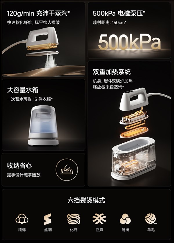 产品搭载双重加热系统,机身与熨斗双锅炉同步加热,将蒸汽层层处理为微米级,