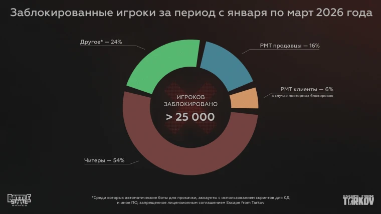 近日,Battlestate Games发布官方博客,首次详细披露了2026年第一季度《逃离塔科夫》的账号封禁数据。从1月至3月,共有约2.5万个账号被封锁。其中仅54%因使用作弊软件被封,其余46%因违反其他规则受到处罚。