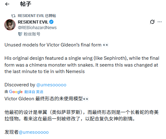 《生化危机9》最终Boss废案设计:右肩翅膀霸气侧漏