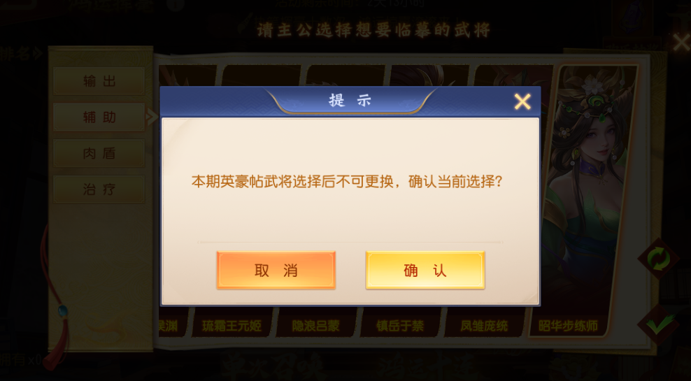 3、活动卡池分为次数无限的俊杰帖和次数有限的英豪帖,主公可选择不同的名帖进行挥毫召唤,可获得汉将等珍稀道具;