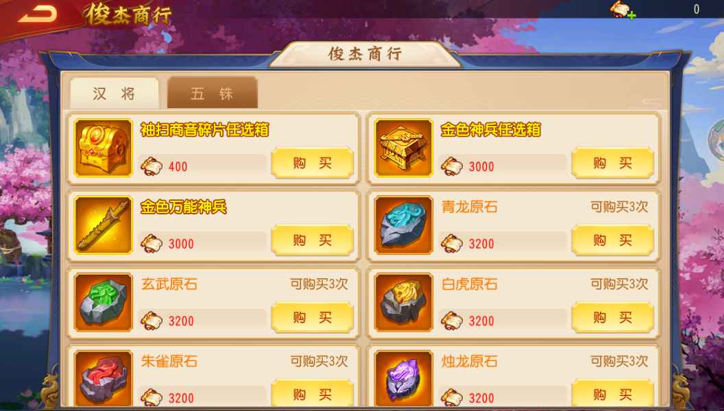 3、主公获得的「五铢钱」可以在五铢商店中兑换你想要的物品哦,原石、礼记周易、将星、洗练石、鲛油长明灯、北斗司南、金色万能神兵等海量道具和资源统统都有。