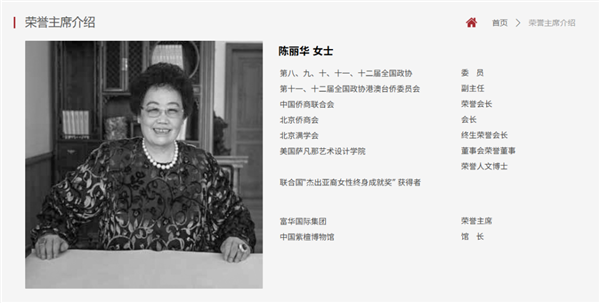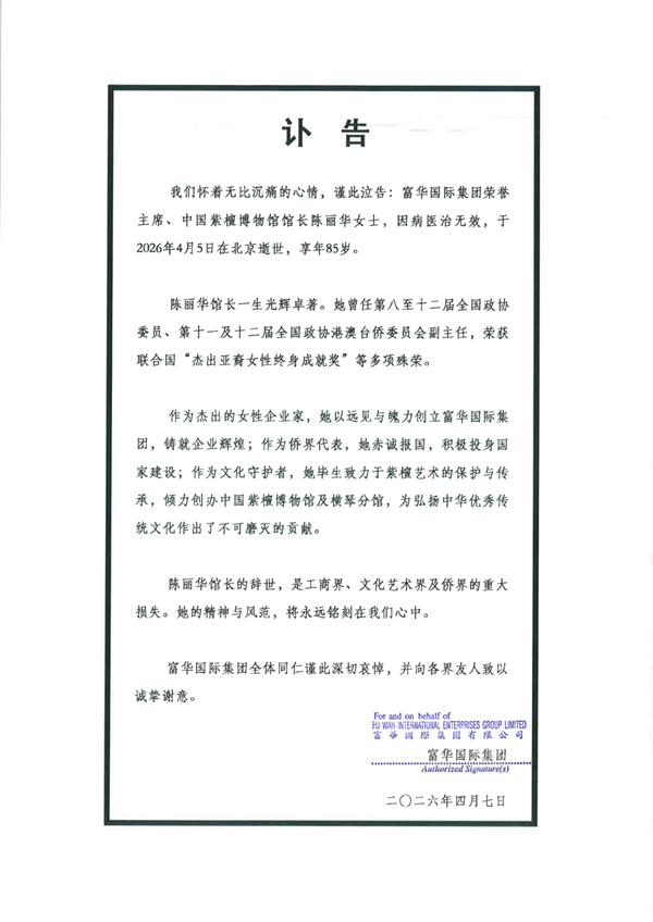今日,富华国际集团官网发布讣告:富华国际集团荣誉主席、中国紫檀博物馆馆长陈丽华女士,因病医治无效,于2026年4月5日在北京逝世,享年85岁。 目前,富华国际集团官网页面已变黑白。