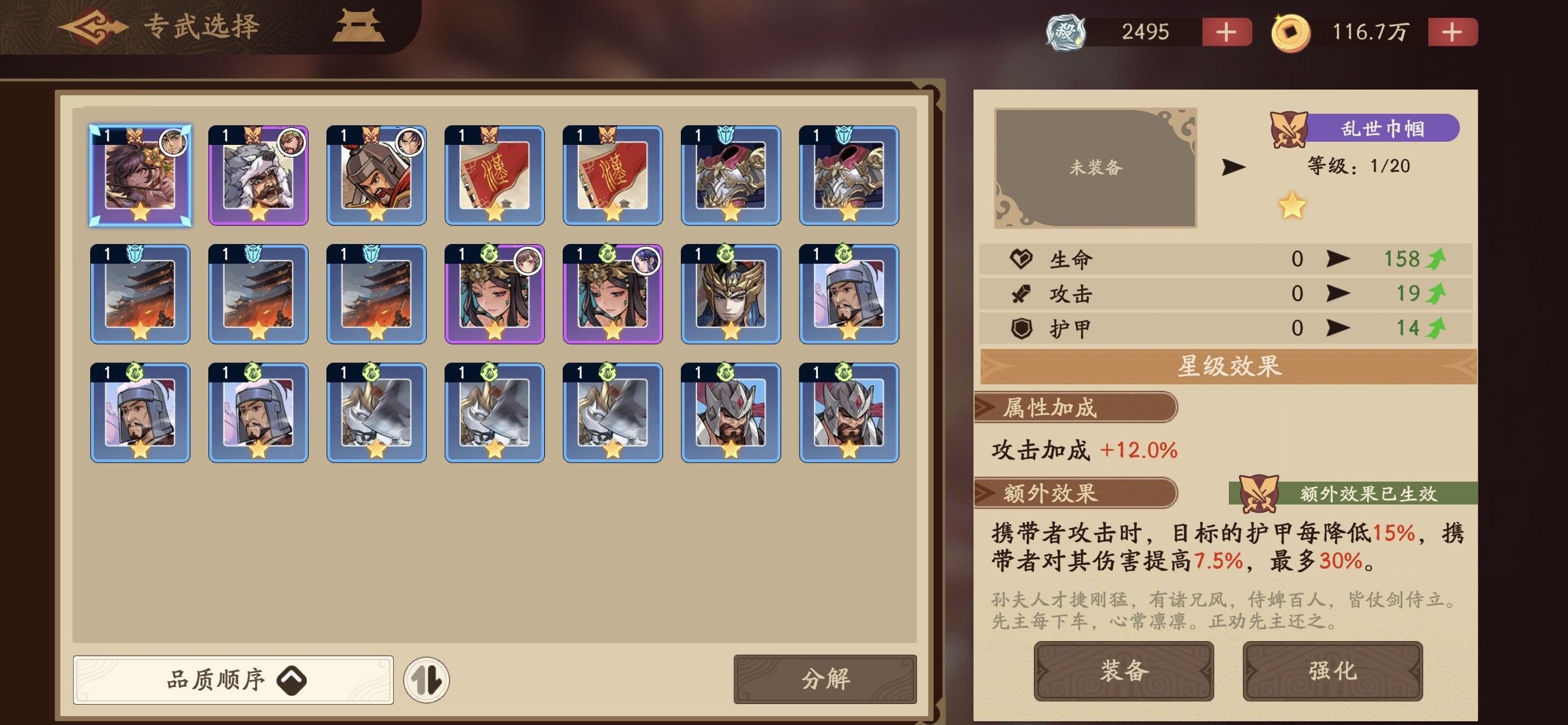 在专武方面,小编认为可以带乱世巾帼,目标护甲降低越高,携带者对其造成的伤害就越高,比较符合王朗的技能特点。在锦囊方面推荐携带万箭齐发。两件套提高暴击率,四件套在攻击暴击时有几率增加真实伤害,也可以携带火攻、决斗。主属性方面选择的是速度、攻击加成和暴击伤害,副属性选择暴击和暴击伤害。阵容搭配方面,王朗需要一定的时间积累才可以提高自身的输出能力,所以可以搭配一个副c走输出的路线,可以选择和孙尚香、徐盛等一起组队。
