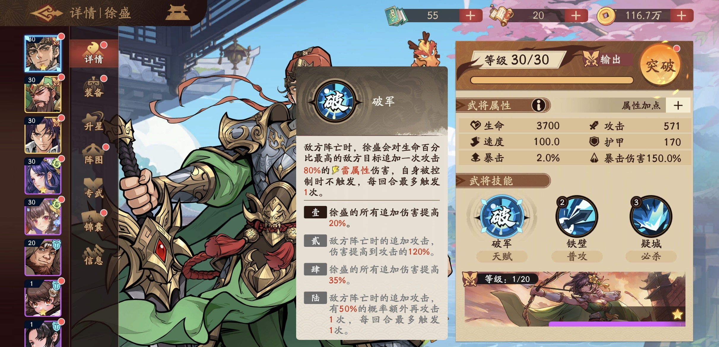 阵容搭配方面,有了这样的奶妈之后,接下来需要补足输出主C,前期就可以获取到的徐盛或者是在专属池子中抽取到的关羽或是周瑜,都很适合作为主C。徐盛的特点是可以进行高额追加伤害,周瑜的天赋是在释放大招之后有几率再释放一次,而且是群体伤害。关羽擅长单体输出,追击能力出色。可以从中三选二,作为主C和副C,在步练师的辅助下输出。