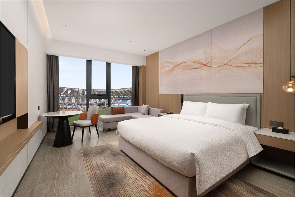 酒店拥有107间沉稳大气而不失时尚感的客房及套房,全屋配备智能客控系统,65寸高清液晶电视支持手机一键投屏,让商务办公与娱乐休闲无缝切换。客房选用全球知名寝具品牌、高品质环保沐浴产品,卫浴空间干湿分离,配备热带雨林沐浴系统与智能马桶,以国际标准硬件保障入住舒适度。高品质羽绒及亲肤寝具,则让宾客在赛事或差旅之后,能获得一夜安眠。