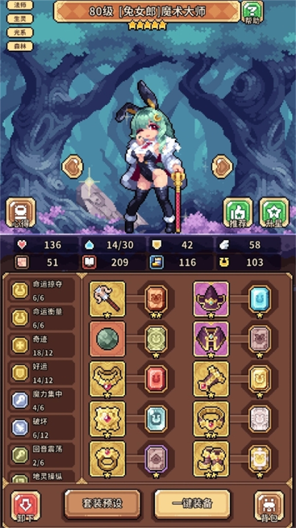 装备:兔子魔法师前期直接用推荐装备,全套幸运装,宝石全部带幸运,不用组套装,它的大招是幸运越多连击越多,所以就堆幸运就完了,后期把头换成新手平原红装草帽(因为是直接伤害,有可能不会破防,所以草帽必备),项链换成荒凉戈壁宿命项链,其他装备可以在几个加幸运的羁绊满了后酌情替换。