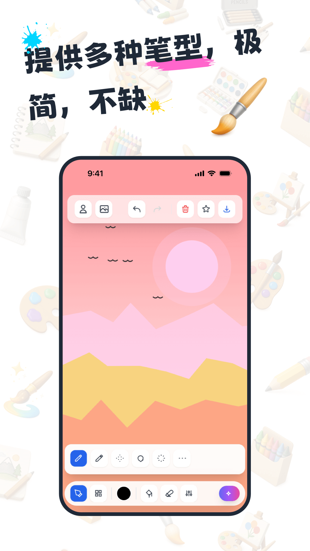 如果你想进行一个自由同时充满想象力的创作,来绘画板就对了。绘画板不仅有多种不同类型和颜色的画笔,满足你对于颜色、线条大小的需求,同时还可以帮助你进行对于作品的管理,创作好的作品全部都可以帮你保存起来。