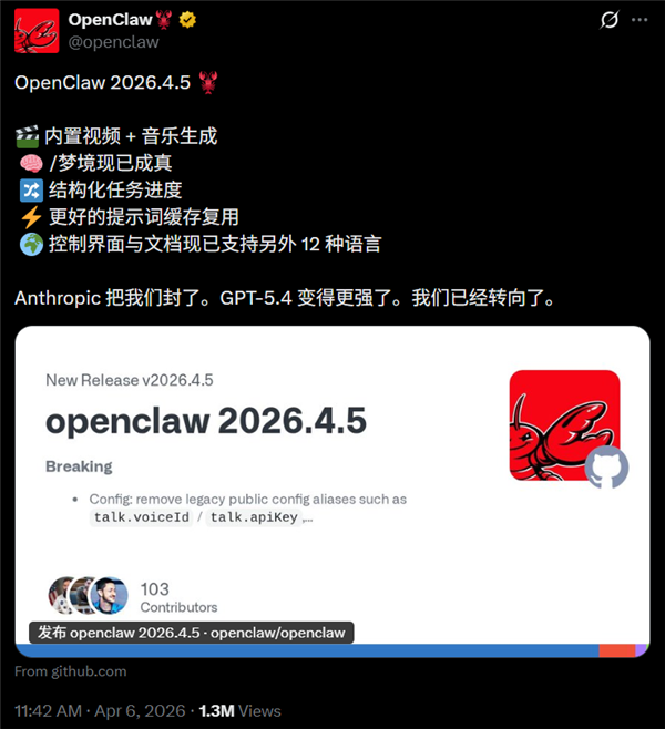 仅隔48小时,OpenClaw便发布了2026.4.5重磅更新,完成强势反击,首次实现原生视频与音乐生成,还上线模拟人类睡眠的“梦境”记忆系统。
