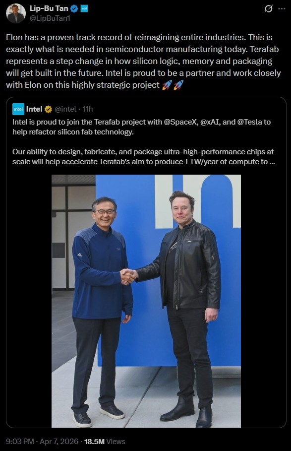 英特尔发表公告称,公司将参与埃隆·马斯克的Terafab超级芯片工厂项目,与SpaceX、xAI、特斯拉公司共同设计、生产、封装超高性能芯片: