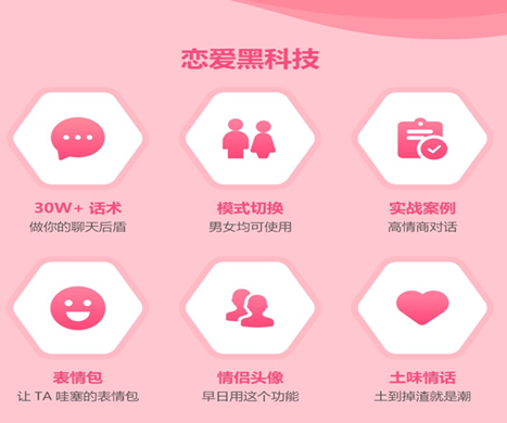 主要面向单身男性,解决单身男士的尬聊难题。软件内置超万条情话话术,搭配15万+精品话术搜索功能,支持一键复制对话,同时设有精选聊天案例、情感导师视频课程、精选文章等模块,帮助各位去快速掌握恋爱沟通技巧。此外,软件还包含人设市场聊天风格切换、藏头诗生成器等实用工具,通过问答社区和恋爱顾问提供专业帮助,支持收藏和分享功能,个性化界面设置可满足不同用户的审美需求,是一款专注于提升恋爱聊天效果的实用工具。
