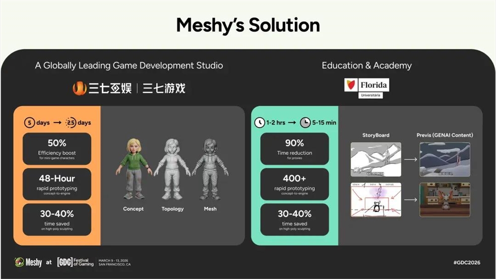 以三七互娱为例,他们的一部分项目团队把原画导入Meshy生成初始模型,随后再交由美术进行精修打磨,提升了50%效率,节省了30%到40%的时间。