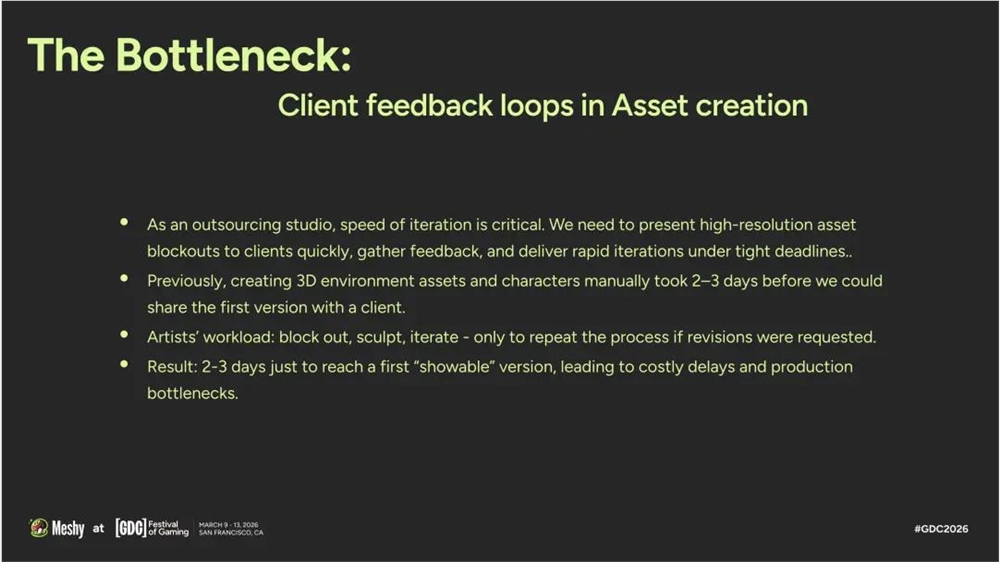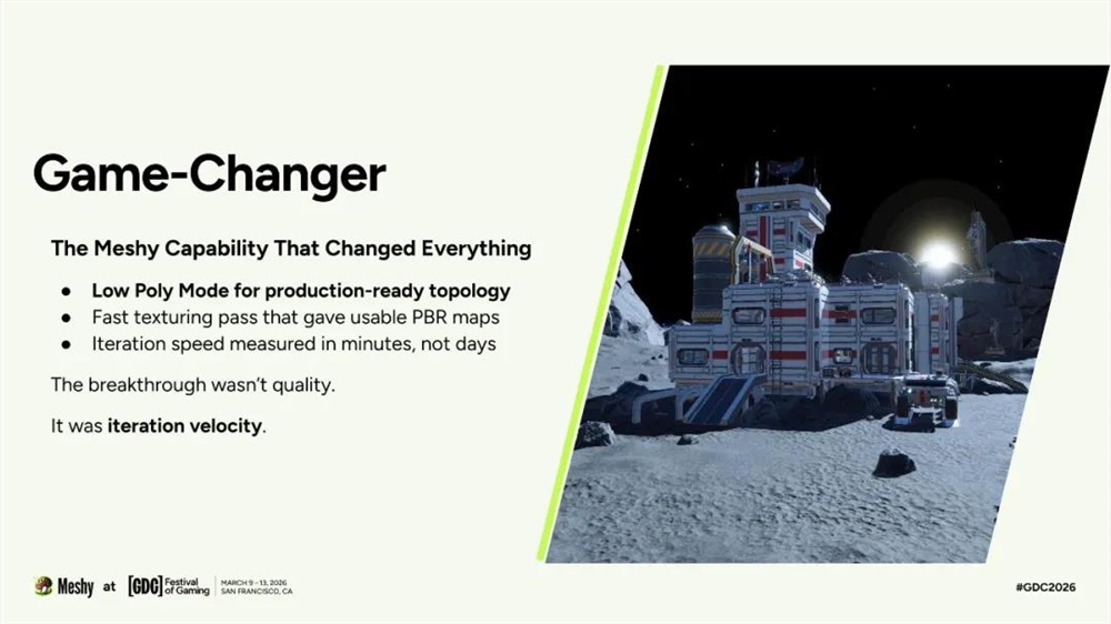 在1小时演讲中,Meshy团队及其客户分享了一些将3D生成工具用在游戏开发中的案例。将Meshy接入工作流后,前期概念网格、低模模型或UGC平台的角色定制等工作,需要的时间从几天压缩到了几小时,甚至几分钟。