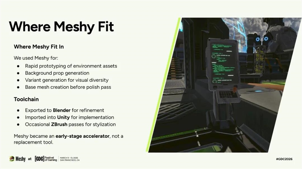 尽管一开始有些阻力,但开发者们尝试过效果后,逐渐也接受了Meshy的融入,就像Technical Art Games说的,Meshy“并没有取代他们的工作,只是他们工具箱里多出来的一件工具而已”。