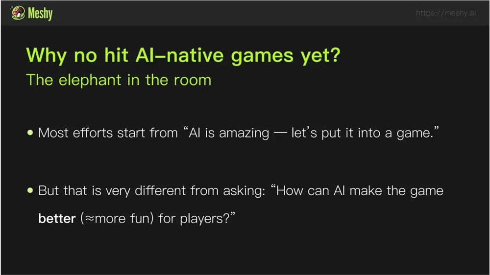 当然,把AI做到玩法里也是有讲究的。胡渊鸣的观点是,在AI原生游戏中,AI必须是核心玩法不可或缺的一部分,而不是拿着锤子找钉子。