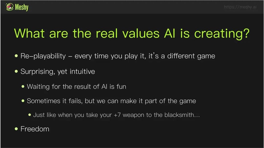 去年10月,葡萄君曾介绍过Meshy,当时的直观感受是,AI生成的质量有了长足进步,终于能成为生产力工具了;而这次GDC上Meshy的分享让我对AI生成如何融入游戏开发有了更清晰的认知。